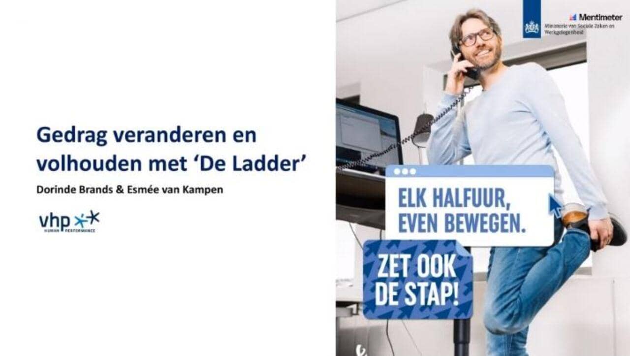 Heb jij ook het voornemen om meer te gaan bewegen tijdens je werk? Door bijvoorbeeld elk half uur even op te staan of elke dag een wandeling te maken tijdens de pauze? Dan vraagt dat zeer waarschijnlijk om gedragsverandering. Maar hoe doe je dat? Hoe kun je makkelijker je gedrag aanpassen om je gestelde doelen te realiseren? En hoe houd je dit nieuwe gedrag vol? In de workshop 'Gedrag veranderen & volhouden met 'De Ladder'' van woensdag 19 mei, vertellen Dorinde Brands en Esmée van Kampen (vhp human performance) meer over de achterliggende principes van de ladder om jou stap voor stap te helpen bij het bereiken van jouw eigen (beweeg)doelen.