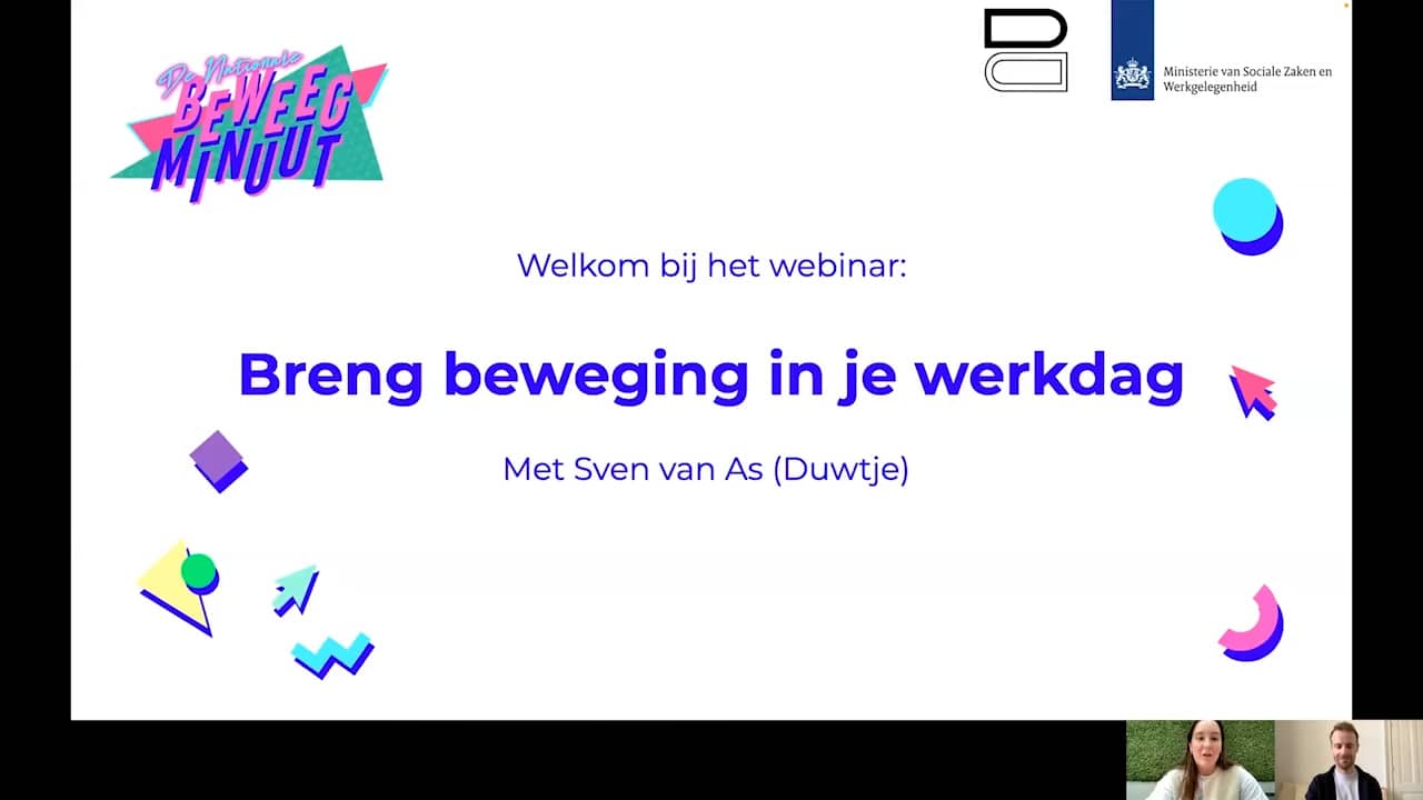 Charlotte: Welkom allemaal bij. We zijn bij het webinar breng beweging in je werkdag, van Sven van Duwtje. Ik ben blij dat jullie hier allemaal zijn. Mijn naam is Charlotte en wij zijn namens het ministerie van Sociale Zaken en Werkgelegenheid aanwezig als co-host van de expert van vandaag en ik zal vooral de vragen uit de chat bijhouden en ook zoveel mogelijk aan Sven voorleggen zodat jullie met alle antwoorden weer naar huis kunnen gaan. Dit doe ik een beetje tussendoor, maar stel vooral dus al jullie vragen in de chat. Dan geef ik die door aan Sven. Jullie zien ook dat ik, of in ieder geval dat de camera's en de microfoons aan staan, deze mag je gewoon ook uitzetten. Maar het is vooral ook zodat we straks wat interactie in het webinar kunnen hebben, en Sven zal dit ook aangeven wanneer dit het geval is. En dan is het leukste als je wel nog even je camera of je microfoon aanzet, zodat we ook een beetje kunnen zien wat er gebeurt. Wij organiseren dit webinar vanuit de campagne de Nationale Beweegminuut. Die is vorige week gelanceerd en met die campagne proberen wij heel zittend Nederland te motiveren om meer te bewegen tijdens het werk. Dus dat is één minuut per dag, om elf uur 's ochtends. Maar het doel is natuurlijk omdat dit zo vaak mogelijk te herhalen. Wij hebben nu vier webinars georganiseerd, dit is de derde en dat gaat vooral over lichamelijke onderbelasting. Dat willen we graag belichten vanuit verschillende perspectieven en vandaag gaat Sven van Duwtje jullie bijpraten over de psychologie van gedragsverandering. En ik moet er wel nog even bij zeggen deze webinar wordt opgenomen en deze later ook wordt gepubliceerd. Dus mocht je het nou niet fijn vinden dat je camera aanstaat zet hem dan vooral uit. Dat is ook helemaal goed. En vergeet ook niet je vragen in de chat te zetten. Dan kan ik dat allemaal doorgeven of opmerkingen of als je gewoon iets wil laten weten, dan geef ik dat door aan Sven. Oké, dan geef ik nu het woord aan Sven.